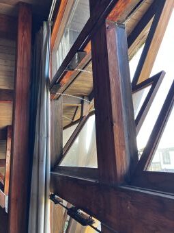 今回の施工は森林公園多目的ホール内の上部排煙設備のオペレーターの交換と木製建具の調整です。